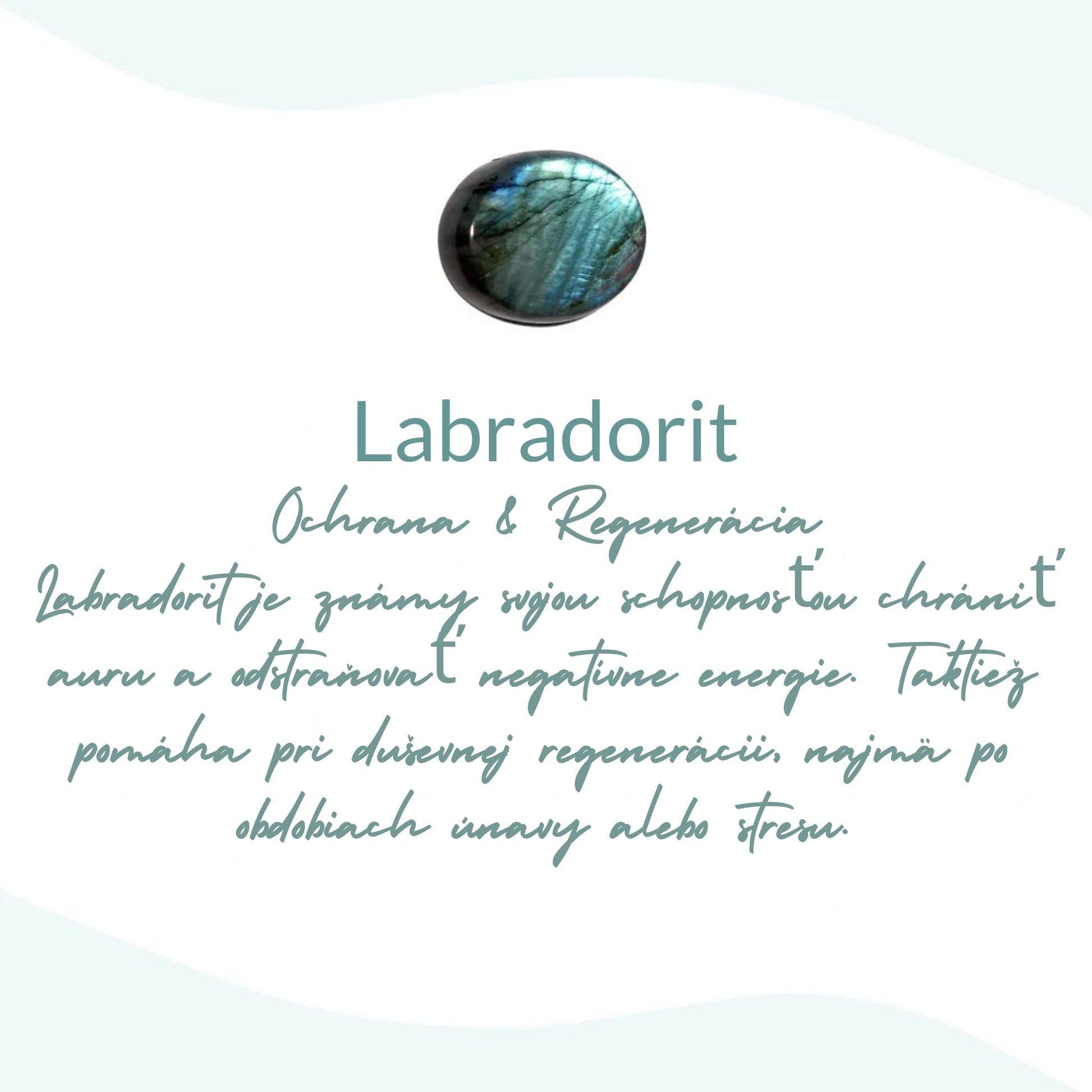 Pravý ochranný kameň, ktorý vás chráni pred negatívnymi energiami a projekciami, ktoré na vás môžu smerovať ostatní. Pôsobí ako štít, absorbuje bolesti, smútky a ďalšie negatívne energie, rozpúšťa ich a chráni vás. Labradorit upokojuje hyperaktívnu myseľ a stimuluje predstavivosť.